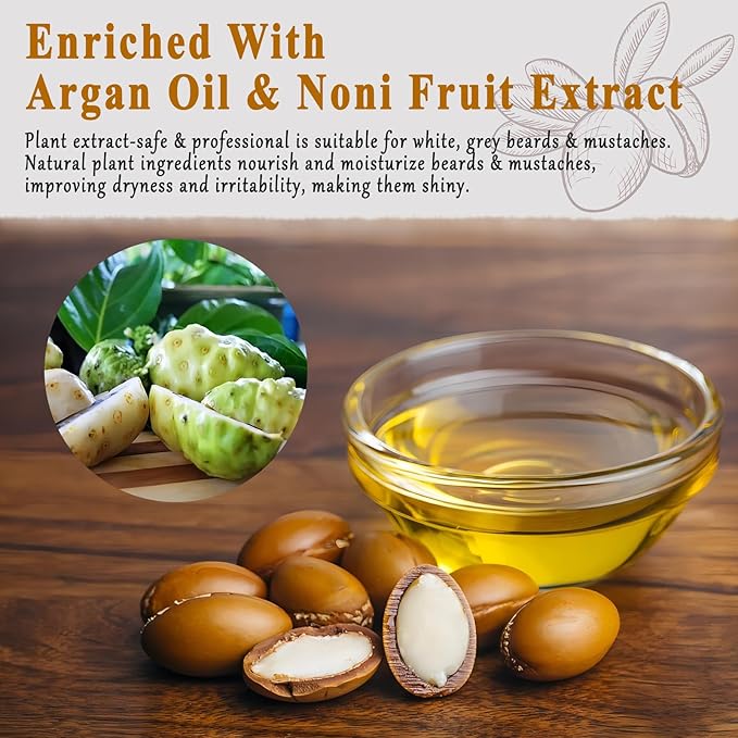 - NATURAL INGREDIENTS: Enriched with argan oil & noni fruit extract. Protect and nourish your white or gray beard while darkening your beard. Skin-friendly to work well on any type of facial hair - beards, mustaches, soul patches, goatees. Take years off your appearance