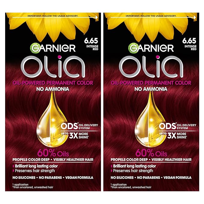 Garnier Olia Hair Color, Oil Powered Ammonia Free Permanent Hair Dye for Long-Lasting Color, 6.65 Intense Red, 2 Dye Kits