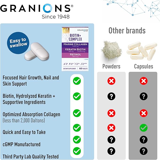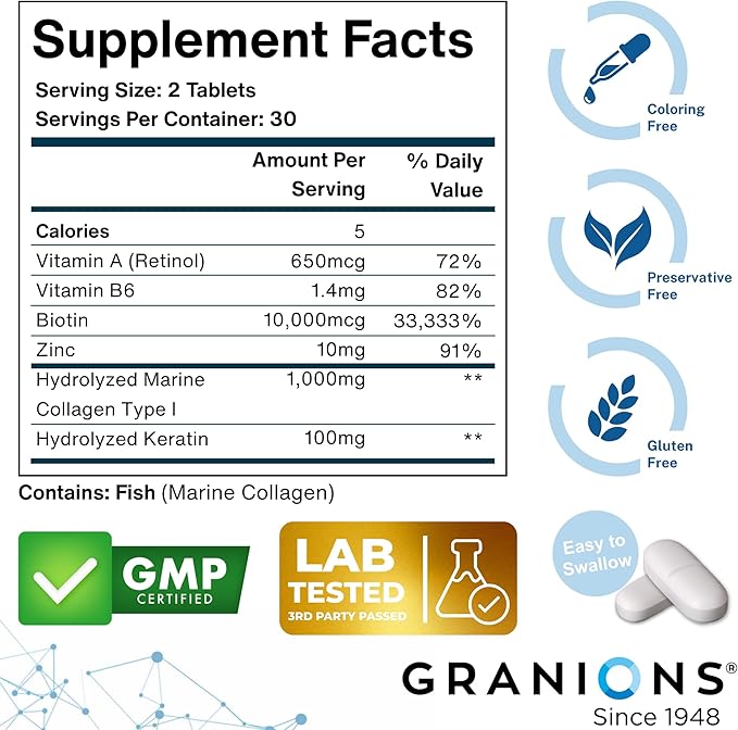 - FOIL-SEALED FOR SAFETY. Easy to swallow tablets, unlike large fish marine collagen capsules and other hair growth products. Preservative & coloring-free, manufactured in cGMP certified facilities.