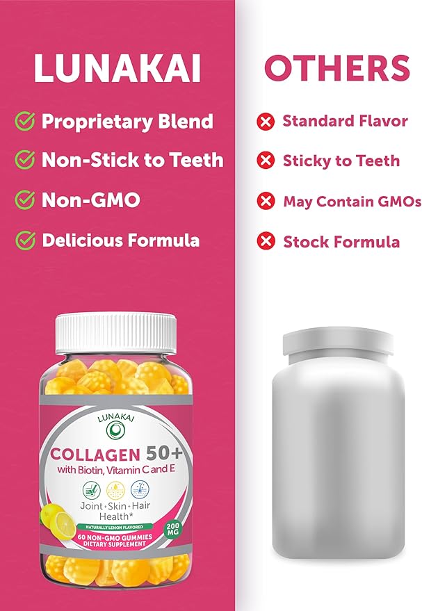 Lunakai USA Made Collagen Gummies for Women & Men Over 50, Biotin & Vitamin C, Supports Skin Elasticity, Hair & Nail Strength, Joint Support, 60ct