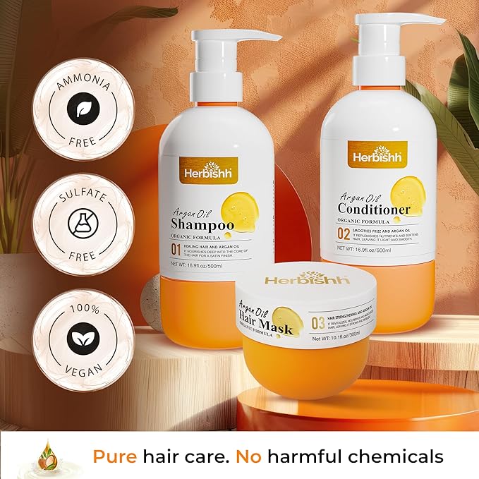 - LUXURY HAIR TRANSFORMATION: Elevate your hair care routine with Herbishh Moroccan Argan Oil Shampoo, Conditioner with Hair Mask. Infused with the pure essence of argan oil, this all natural hair care set promotes hair growth and delivers smooth hair with every wash.