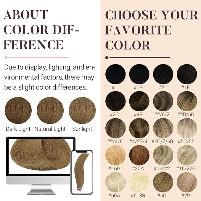 - Tape in Hair Extensions Quality: 100% remy human hair extensions, salon quality, thick & full ends, no split, no tangles, no shedding, soft and smooth,lightweight, ensuring maximum comfort throughout the day and allowing for a natural and seamless look, can perfectly blend with your own hair. It can be washed, straighten, curled, etc