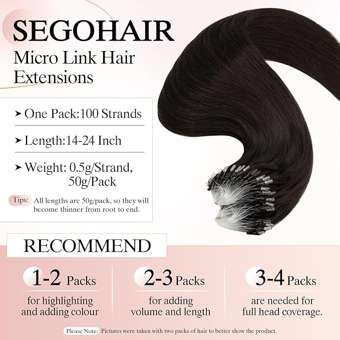 - 【Specifications】 0.5g/strand, 100 strands/pack, all length are 50g/pack.SEGOHAIR micro beads hair extensions are available in lengths ranging from 14 to 24 inches. For the adding volume and length, we recommend using 2 to 3 packs. 1-2 packs can be used for highlighting, while 3-4 packs are needed for full head coverage.