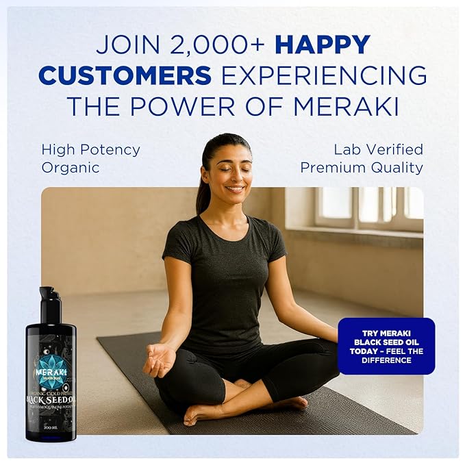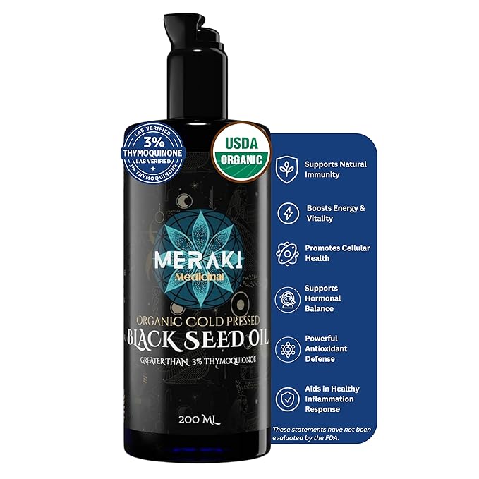 Meraki Medicinal Cold Pressed Organic Black Seed Oil – Nigella Sativa Extract with Thymoquinone in Dark-Tinted Glass Bottle – For Culinary & Topical Use – 200ml
