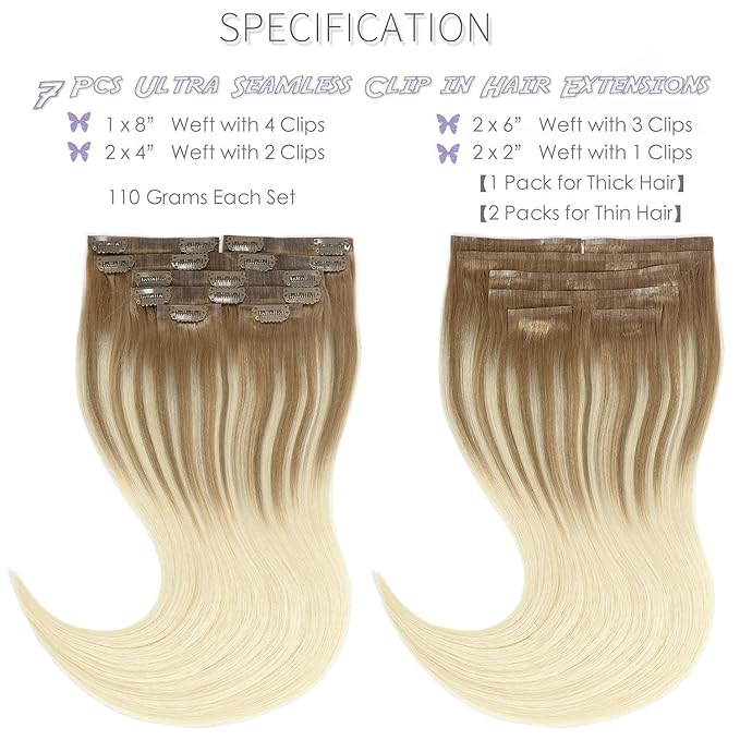 - ♥ 【Hair Extensions Specification】 The NEW Technology Upgrade Version Ultra Seamless Clip in Hair Extensions Human Hair; Length: 14-22"; Quantity: 7pcs/set with 16 Clips Attached; Weight: 110gram. 【New Design: The Width of the Outer Glue is Only 5 mm, which is More Invisible and Comfortable than Ordinary Seamless Clip in hair. Ultra-Thin Roots Fit Perfectly with Your Scalp! Super Flat and Invisible Band 50% Thinner!】