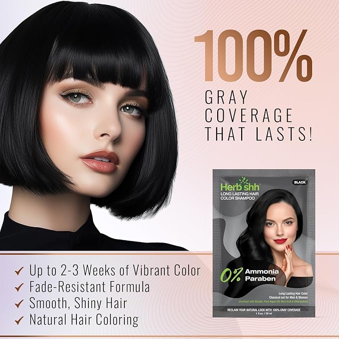 - BLACK HAIR DYE SHAMPOO: Herbishh hair dye shampoo enriched with goodness of botanical ingredients protects and nourishes hair while turning gray strands into a rich black color in just 10-15 minutes. (Note: Do a patch test before first use.)