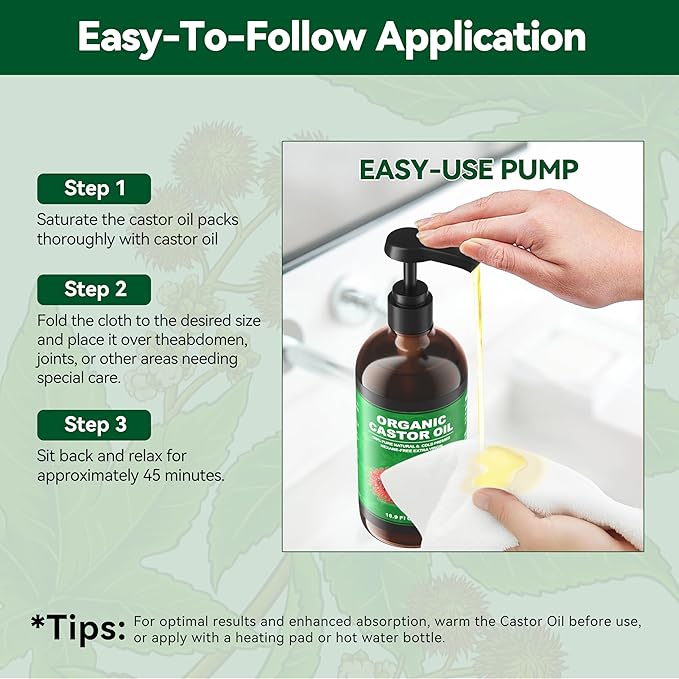 - Holistic Nourishing Castor Oil Kit: The Taoscare 5-in-1 Castor Oil Pack Kit includes 1 Castor Oil Organic Cold Pressed Unrefined Glass Bottle (16.9 FL OZ), 4 Castor Oil Pack Wrap Organic Cotton Cloths, 1 Pump. Start using your kit immediately. It makes a thoughtful gift for Christmas, Thanksgiving, birthdays, or anniversaries, providing all-natural, versatile benefits for a healthier-looking life