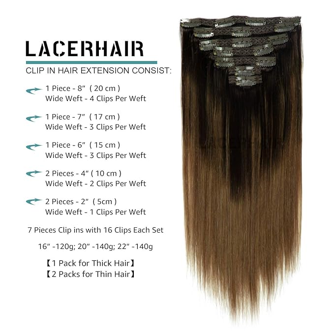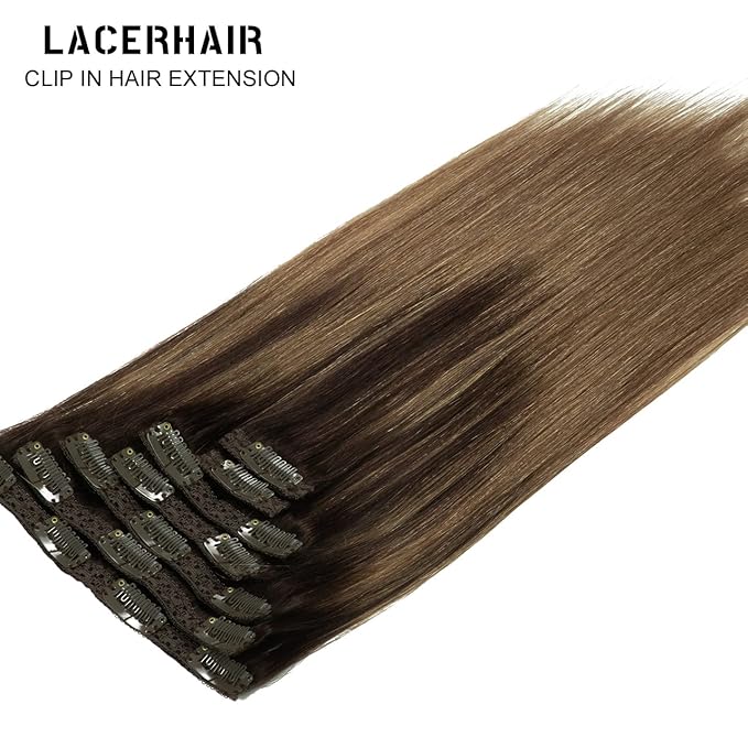 Lacer Dark Brown Roots Clip in Hair Extensions Human Hair Fading to Chestnut Brown Clip in Extensions 22 Inch for Long Natural Extensions Human Hair 140 Grams 7 Pcs