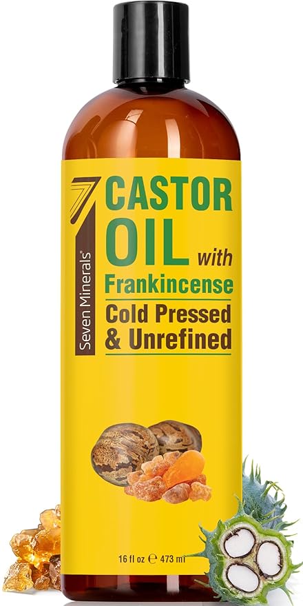 Seven Minerals Cold Pressed Castor Oil with Frankincense - 16 fl oz Bottle - Unrefined & Hexane Free - Hair Growth, Thicker Eyelashes & Eyebrows, Dry Skin Care, Joint and Muscle Relief (Pack of 1)