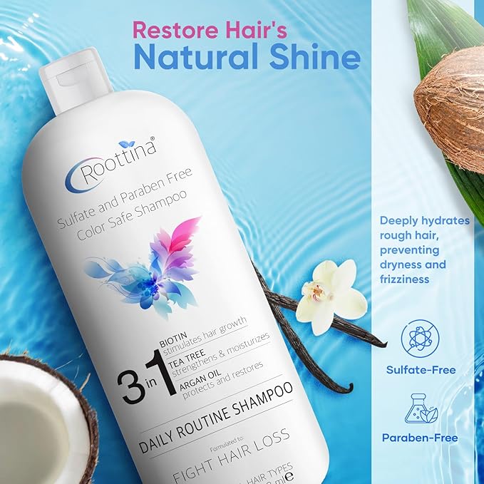 - MOISTURE-RICH FORMULA FOR SMOOTH HAIR: Roottina's unique hydrating formula is packed with essential oils and vitamins to provide deep hydration and long-lasting frizz control. Whether your hair is exposed to daily heat styling, coloring, or harsh environmental factors, our Shampoo for Thinning Hair helps repair and revive it from within. Enjoy silkier, more manageable hair that stays soft, smooth, and nourished with every wash, making it perfect Shampoo for Women Hair Loss.