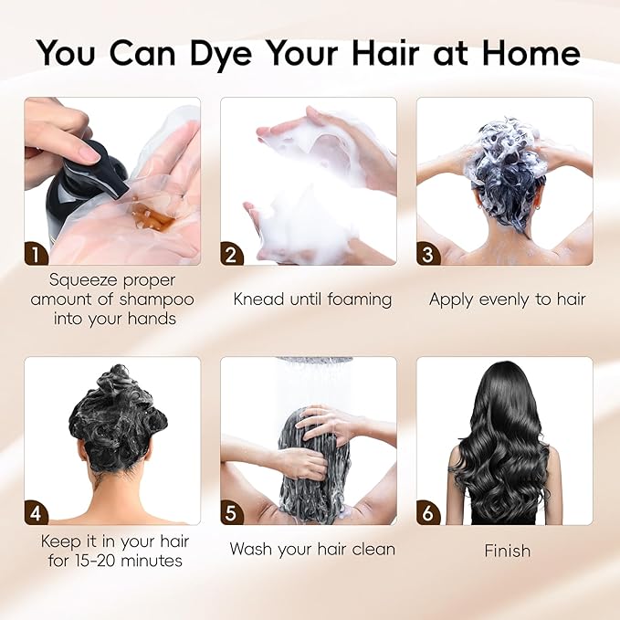 - EASY TO USE: No need for a bowl or brush, Say goodbye to complicated hair dyeing procedures. Simply wear gloves, just wet your hair, apply hair dye shampoo evenly on your hair. Wait for 15-20 minutes (20 minutes for full coverage of gray hair) and black hair dye shampoo will all your gray hair cover up without staining your skin.