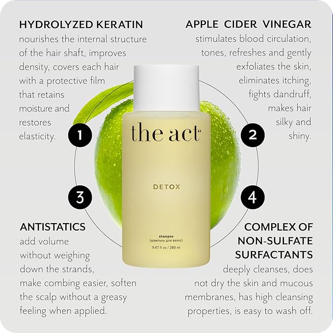 - 💦 Deep Detox for Hair and Scalp: The Act detox shampoo provides deep cleansing that ordinary shampoos can’t achieve, removing buildup from styling products like silicones. These impurities can make hair heavy and dull, which is why periodic detox is essential for vibrant, light, and manageable hair. Use this shampoo to restore your hair’s natural luster and help it regain a healthy, smooth appearance.