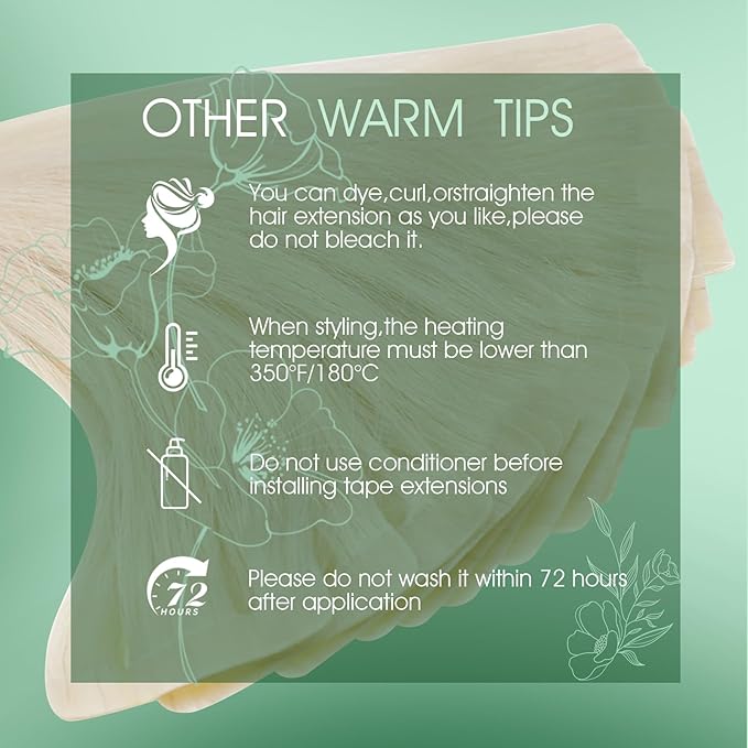 - Installation: Do not use conditioner or other products before wearing. Using a heating plate while wearing can increase the tape's stickiness. Do not wash your hair within 72 hours after installation.