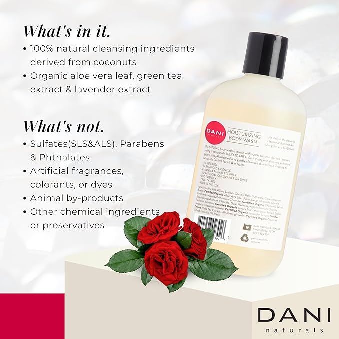 - ● Great for Sensitive Skin: DANI Naturals Moisturizing Body Wash is pH balanced and incredibly gentle. The 100% sulfate-free formula, made with coconut-derived cleansers,is perfect for sensitive skin, providing a soothing cleanse without irritation.