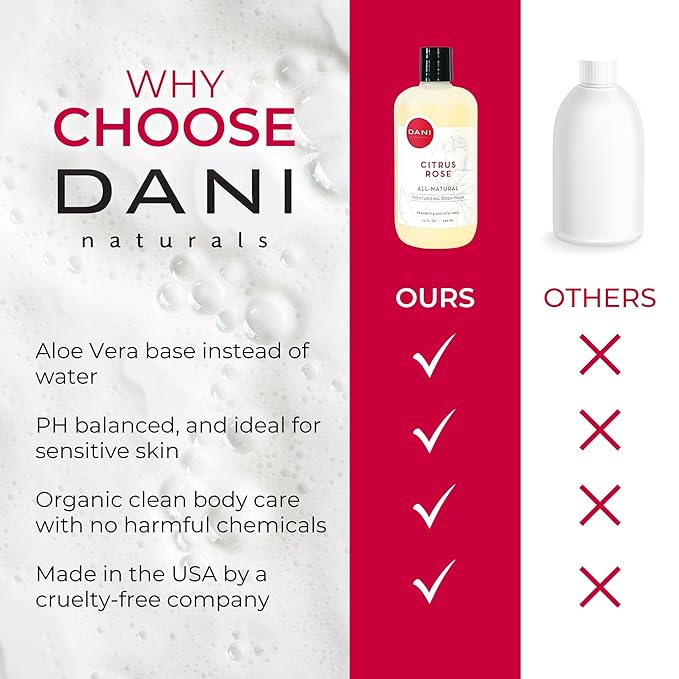 - ● No Harsh Chemicals: DANI Naturals Moisturizing Body Wash is vegan, pH balanced, and free from parabens, phthalates, and other harsh chemicals. Non-toxic and proudly crafted in the USA, it’s a gentle and effective choice for your daily skincare routine.