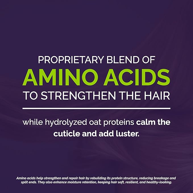 - Hydrolyzed Oat Proteins for Added Luster: Formulated with hydrolyzed oat proteins to calm the hair cuticle and enhance its luster. The oats work to smooth the surface of your hair, giving it a radiant shine and a sleek, polished finish without weighing it down.