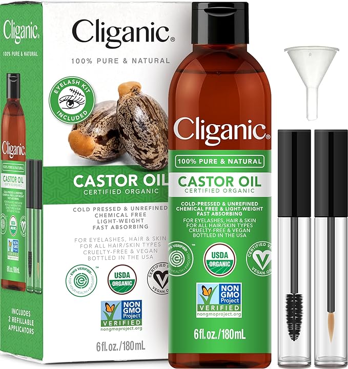 Cliganic Organic Castor Oil, 100% Pure (6oz with Eyelash Kit) - For Eyelashes, Eyebrows, Hair & Skin