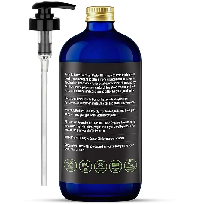 - Includes: (1) 16.9 Fl Oz Designer Glass Bottle with Pump of Premium 100% PURE USDA Certified Organic Castor Oil. TURN TO EARTH premium castor oil is sourced from the highest quality castor beans in the world and manufactured in the USA in order to offer luxurious and therapeutic applications while supporting healthy hair, skin, nails, lashes, eyebrows and more.