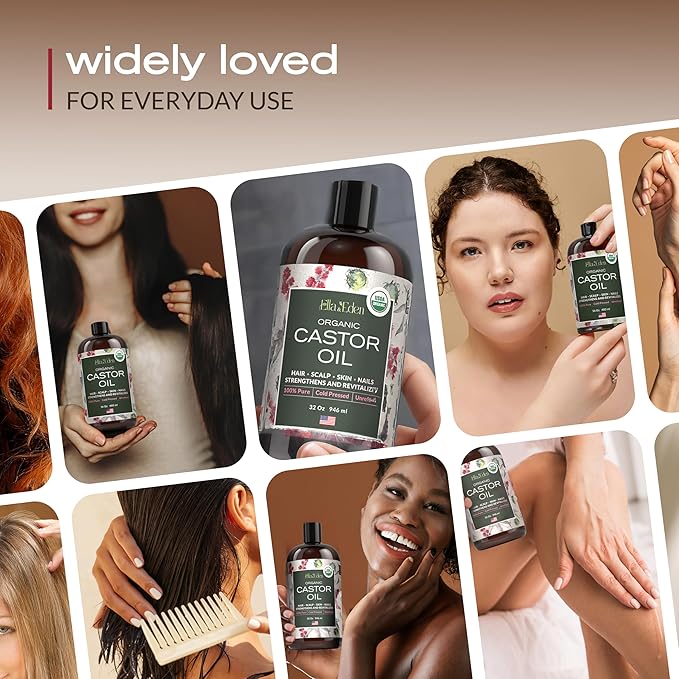 Ella & Eden Organic Castor Oil – Cold-Pressed, Hexane-Free, USDA Certified, Unrefined & 100% Pure | For Hair Growth, Skin and Face – 32 fl oz