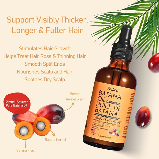 - STIMULATES HAIR GROWTH: Foikoo batana oil Rich in Essential Omega-3 Fatty Acids, Powerful Antioxidants, Vitamin E, Oleic Acid, Linoleic Acid and Oleanolic Acid. this formula nourishes the scalp, stimulates hair follicles, and promotes the development of thicker, stronger, and healthier hair