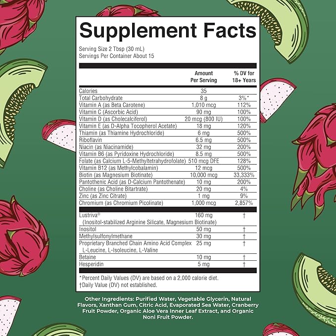 - WOMEN HAIR GROWTH SUPPLEMENT: Enjoy this delicious liquid multivitamin in a peach mango or dragon fruit melon flavor and receive all of these nutrients plus Lustriva for thicker, fuller hair in women with just two tablespoons per day!