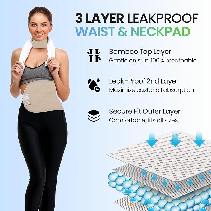 - Complete Castor Oil Pack Wrap Set for Detox & Wellness: Includes 2 reusable, adjustable castor oil pack wraps (waist + neck) and a 118-oz bottle of pure organic castor oil. Ideal for liver detox, stomach bloating, and neck pain relief. A must-have for your full-body self-care routine.