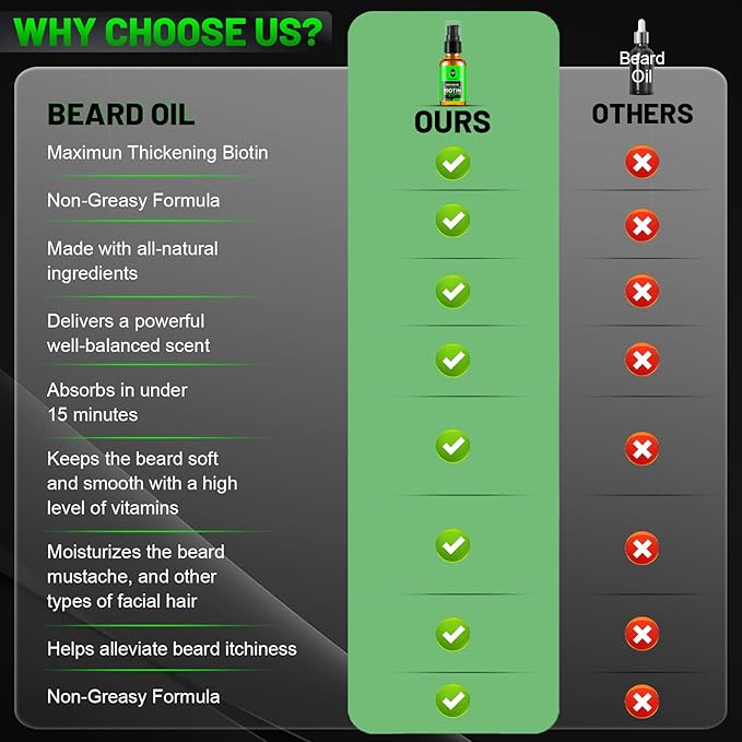 - 【MAXIMUM CONCENTRATION BIOTIN BEARD OIL】 Our beard oil is specifically formulated to promote beard growth and soften your beard. Biotin, one of the key ingredients, helps strengthen hair follicles, promoting healthy beard growth. As a topical application, biotin nourishes your hair follicles and prevents shedding while revitalizing and improving the appearance of your weak and damaged hair