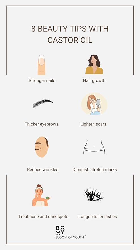 - Youthful Self: Castor oil is rich in antioxidants, providing deep hydration and nourishment to skin, hair, nails, eyebrows & eyelashes. Packed with essential fatty acids and vitamins, it helps restore moisture, and promote healthy growth. Additionally, its cleansing properties help eliminate harmful toxins from the body, leaving you feeling refreshed and revitalized.
