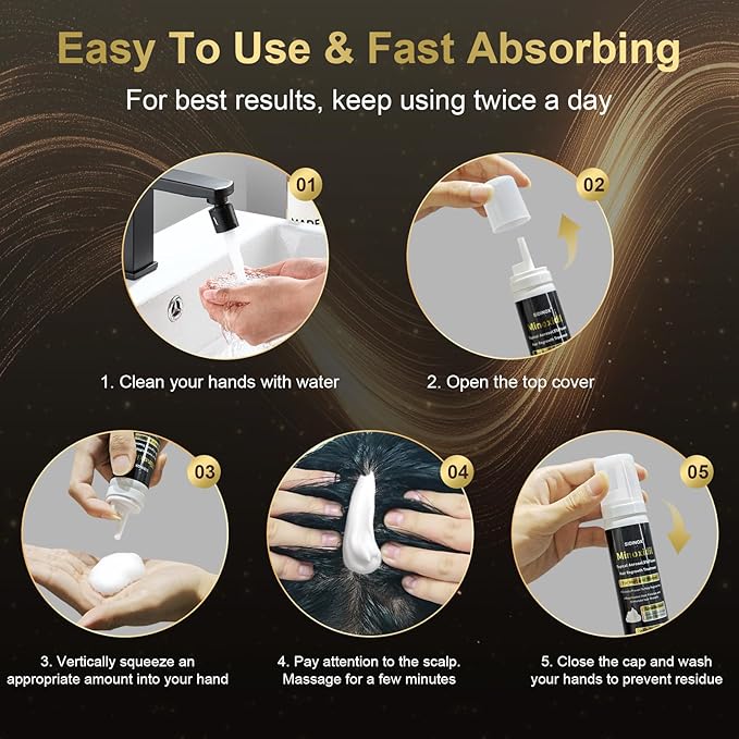 - 【Easy to Use, Fast & Non-irritating】: This product makes hair loss treatment is easy in your daily hair care routine, apply 1ml foam to your scalp twice daily & massage it in. Visible results may appear in just 3 months. It is also effective for promoting beard and eyebrow growth.