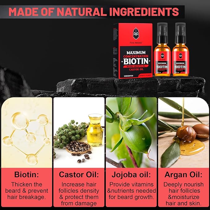 - 【MAXIMUM CONCENTRATION BIOTIN BEARD OIL】 Our beard oil is specifically formulated to promote beard growth and soften your beard. Biotin, one of the key ingredients, helps strengthen hair follicles, promoting healthy beard growth. As a topical application, biotin nourishes your hair follicles and prevents shedding while revitalizing and improving the appearance of your weak and damaged hair