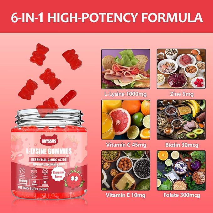 - Raspberry Flavor & Easy to Take – No more large pills or capsules! Our delicious, plant-based lysine gummies are perfect for those who prefer an easy, tasty, and convenient way to get their daily lysine intake