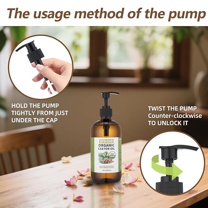 - USDA Certified Organic Castor oil:Our organic cold pressed castor oil is extracted without hexane, which ensures that the castor oil is not exposed to high temperatures that can damage key vitamins and minerals, leaving you with only 100% natural, No Additives,Non-GMO,high quality castor oil 16oz/473ml,with pump,amber glass bottle protection,designed to help preserve the integrity of the oil for your peace of mind