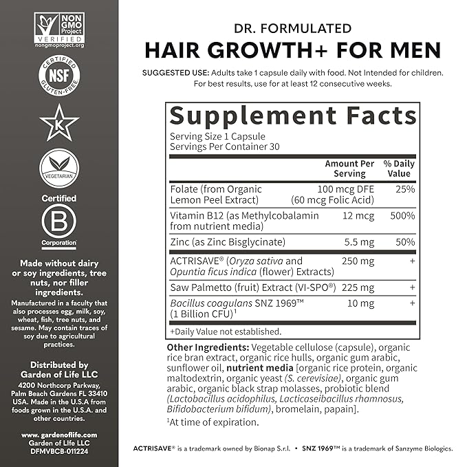 - NON-GMO PROJECT VERIFIED: Dr. Formulated Hair Growth* for Men is Non-GMO Project Verified, NSF Certified Gluten Free, and Vegetarian