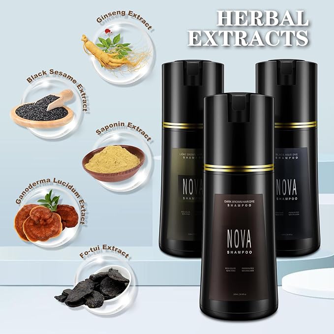 - 【Safe and Effective】:Nova Shampoo Color Shampoo 3 in 1,rich in Natural Botanical Formulation, Our hair color is different from traditional hair dyes, free of parabens and harsh chemicals. Dark brown/black hair color can be used not only as a hair dye but also as a shampoo and conditioner. It is very convenient to dye your hair black at home.