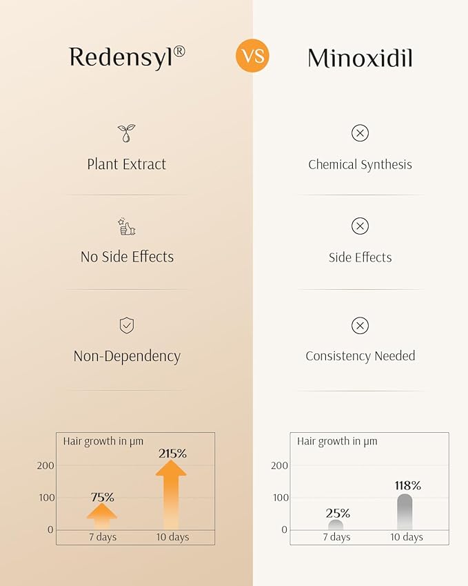 - 【Clinically Proven Results】 Users of the hair growth products containing Redensyl ingredients experienced a 9% or greater increase in hair growth and a 17% reduction in telogen effluvium. Redensyl achieved nearly twice the growth of hair follicles compared to Minoxidil without any side effects.