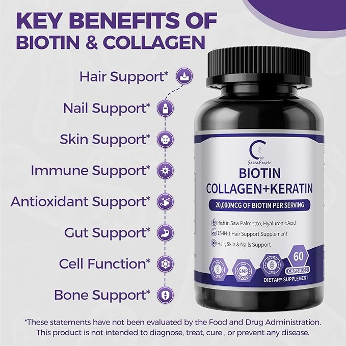 - POWERFUL BIOTIN SUPPLEMENT - GREENPEOPLE Biotin Supplement is packed with powerful biotin, collagen, keratin, and a variety of essential nutrients. Highly bioavailable formula promotes rapid and effective absorption to protect your health and beauty.
