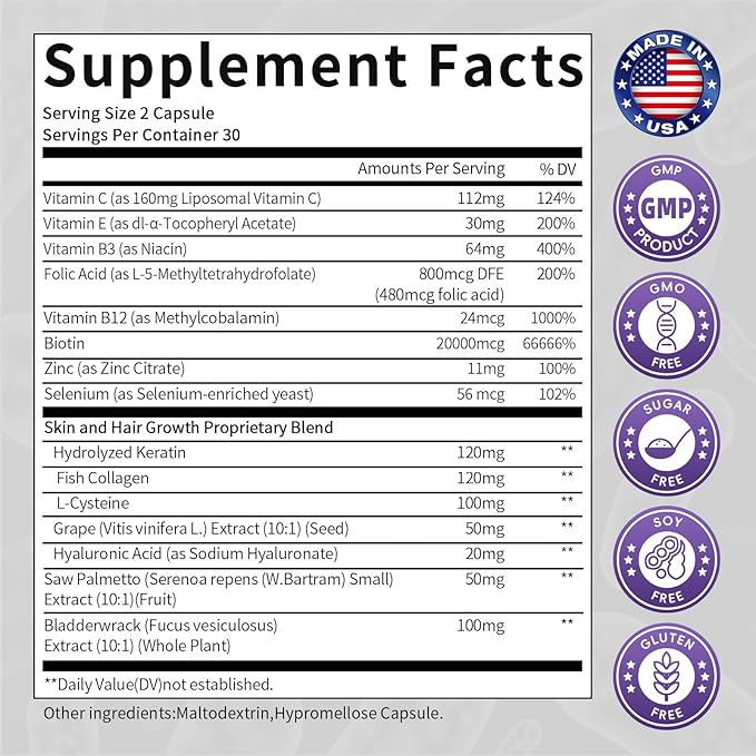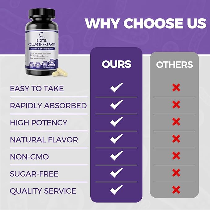 - PROPRIETARY BIOTIN BLEND -Our carefully formulated hair vitamins support follicle strength, nourish the scalp, and promote a balanced lifestyle. Just 2 capsules daily are all you need to feel the powerful benefits of our biotin and collagen supplement.