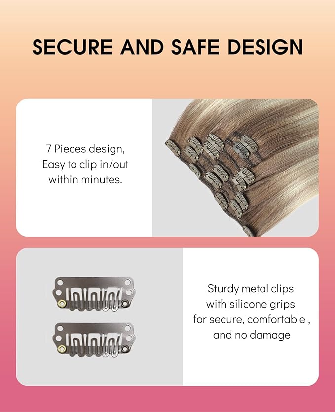 - Secure and Safe Design:Youngsmile 7Pcs/Set clip in hair extensions human hair(14-22inch:120g),Sturdy metal clips with silicone grips for secure attachment, comfortable wear, and no damage to natural hair, ideal for DIY styling. Easy to clip in/out within minutes