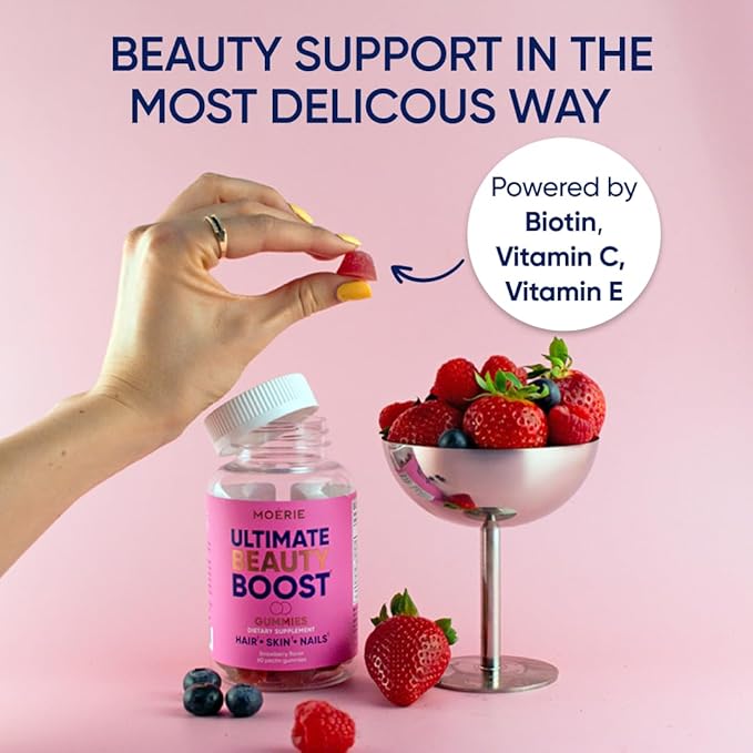 - Wellness That Tastes as Good as It Feels! Upgrade Your Routine With Something You’ll Actually Enjoy — A Sweet Strawberry Biotin Gummies That Makes Beauty Support Fun Again. Packed With High-Potency Biotin, Vitamins C & E, and Clean Ingredients You Can Trust. Moerie Hair Nails and Skin Vitamins for Women and Men – Support Radiant Hair, Glowing Skin, and Strong Nails in the Most Delicious Way.