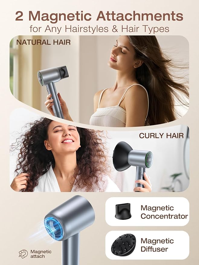 - Quick Install & Safe: The magnetic attachment can be installed with one click, making installation easier. The nozzle fits the hair smoothly, easily managing a variety of hairstyles such as curly hair and straight hair, reducing frizz damage and blow drying hair more efficiently. Our hair blow dryer are equipped with Standard UL-certified US ALCI safety plug for better protection
