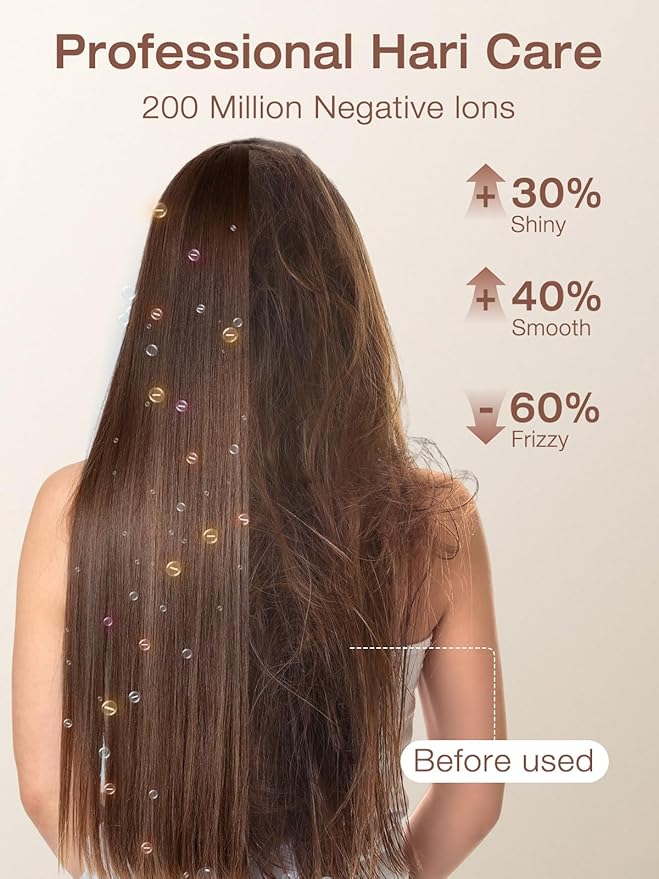- Negative Ion Hair Care: Our ionic hair dryer can release 200 million negative ions during the blow-drying process, which quickly neutralizes static electricity during blow-drying and easily says goodbye to frizz. Ions penetrate the hair deeply to lock in moisture, leaving the hair smooth and not dry after blow-drying, with an airy and fluffy effect, while also creating a healthy hairstyle with a natural luster.