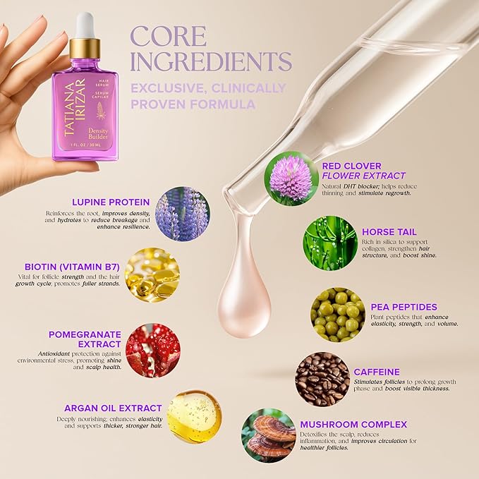 - POWERFUL HAIR THICKENING FORMULA – CLINICALLY TESTED INGREDIENTS: Tackle thinning hair head-on with our advanced thicker fuller hair serum for women. Formulated in the USA with Lupine Protein, Pea Peptides, Argan Extract, and Biotin, this potent blend strengthens hair, boosts density, and promotes visibly fuller, healthier-looking hair. Includes Red Clover, Horsetail, Mushroom Complex, Pomegranate, and Caffeine for a 360° scalp treatment.