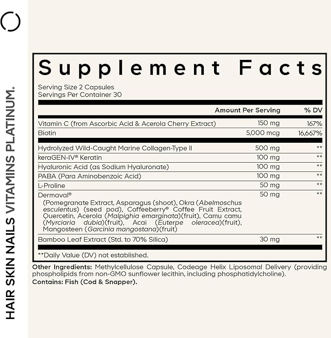 - Clinically Studied Ingredients: Codeage Hair Skin Nails Platinum is a premium supplement formula that offers keraGEN-IV keratin, a clinically studied ingredient that may help support the structure and appearance of hair, skin, and nails.* keraGEN-IV may work synergistically with collagen to promote the body’s ability to produce structural proteins to positively support wrinkles, hair follicles and nails.*