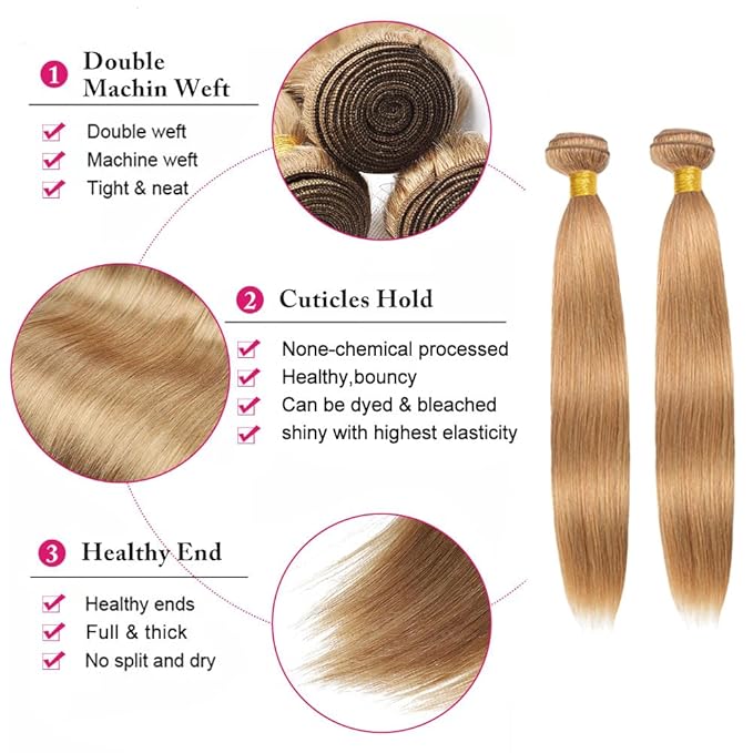 - 【Human Hair Bundles Feature】:#27 Blonde Straight 2 Bundles Of Human Hair Bundles Per Pack, Optional From 12-34 Inches, With 100 ± 5g Per.The Straight Texture Is Nice And Soft To The Touch,Natural ,Blends Well With Your Own Hair.